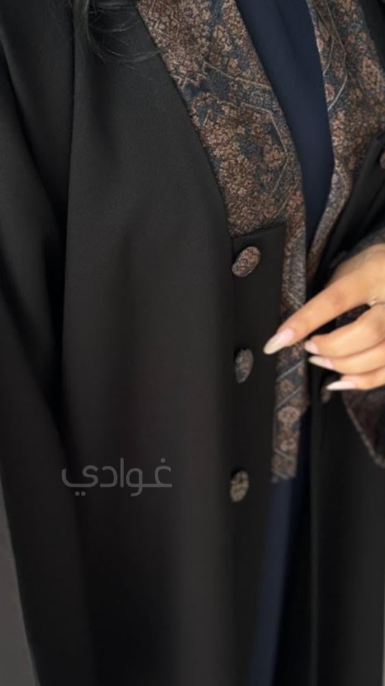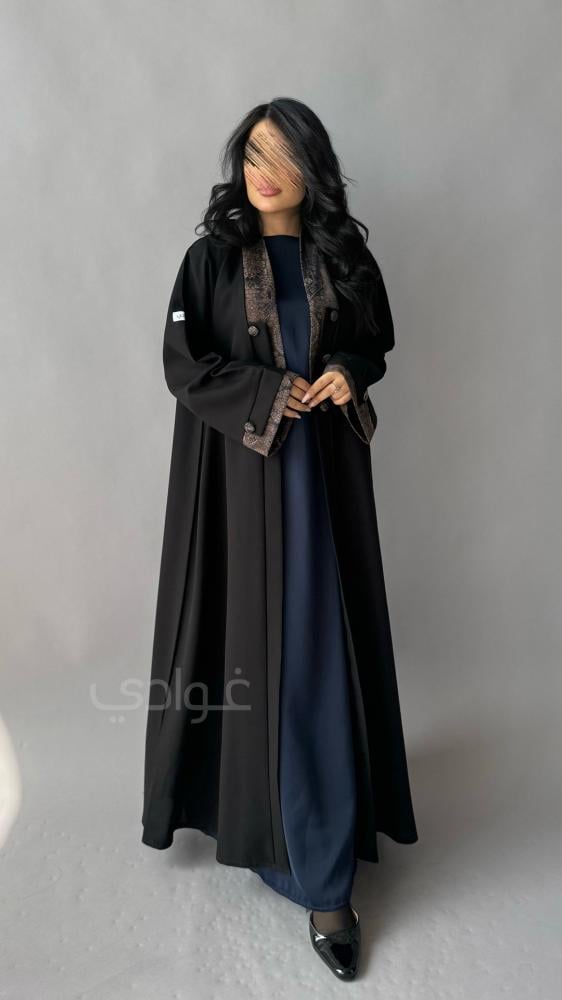 عباية سوداء ربع كلوش بقماش ليمار بتداخل قماش لينن هندي منقش من دار غوادي هي تصميم فاخر يعكس الأناقة و التفرد.