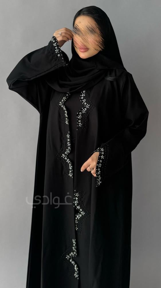 تتألق العباية بشك يدوي متقن، يضيف لمسة فنية راقية تعبر عن الذوق الرفيق و الاهتمام بالتفاصيل.