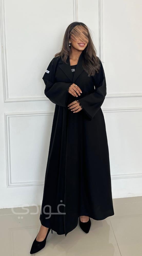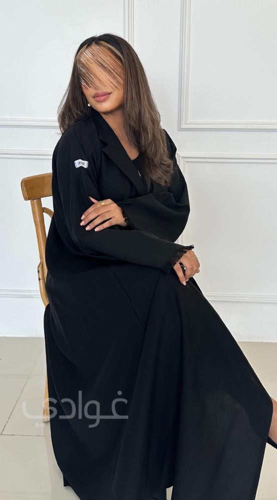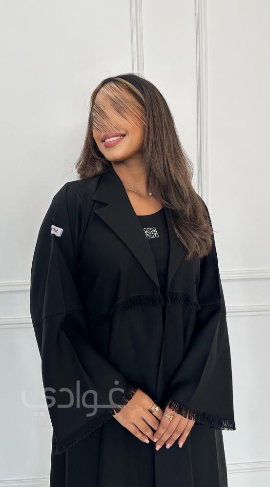 تزدان العباية باللون الأسود و بتفاصيل من الشراشيب بالياقة والأكمام بطريقة أنيقة.