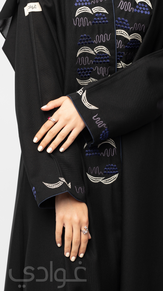 عباية كلوش السوداء، بتصميمها الفريد وتفاصيل دقيقة بألوان الأزرق والبني والأبيض من الأمام.